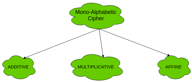 (a). 加法密码(移位密码/凯撒密码)–最简单的单字母密码就是加法密码。它也被称为“移位密码”或“凯撒密码”。顾名思义,对明文进行“模2加法”运算后,就可以得到密文。C = (M + k) mod nM = (C - k) mod n其中,C -> 密文M -> 明文/原文k -> 密钥密钥的范围为26,因此这种密码的安全性并不高。可以通过暴力破解来破解它。有关更多信息及实现方式,请参阅凯撒密码的相关内容。(b). 乘法密码法 –乘法密码与加法密码类似,不过在加密过程中,密钥位需要与明文符号相乘。同样地,在解密时,密文也需要与密钥的乘法逆元相乘,这样才能得到原始的明文。C = (M * k) mod nM = (C * k-1) mod n其中,k-1就是k的乘法逆元。乘法密码的密钥空间为12,因此它的安全性也不高。(c). 仿射密码术 –仿射密码是加法密码与乘法密码的结合体。其密钥空间为26×12,即312。由于密钥空间较大,因此这种密码方式相对较为安全。这里使用两个密钥k1和k2来表示加密与解密的过程:C = [(M * k1) + k2] mod nM = [(C - k2) * k1-1] mod n有关更多信息及实现方式,请参阅“仿射密码”相关内容。现在,让我们来了解一下多字母密码吧。 - 多字母密码法 –在多字母密码中,明文中的每个符号都会被映射到一个不同的密文符号,而这与该符号在明文中的出现次数无关。同一个符号在不同位置出现的映射关系也是不同的。例如,在明文“follow”中,映射关系如下:f -> qo -> wl -> el -> ro -> tw -> y因此,对应的密文就是“qwerty”。多字母密码的类型有: