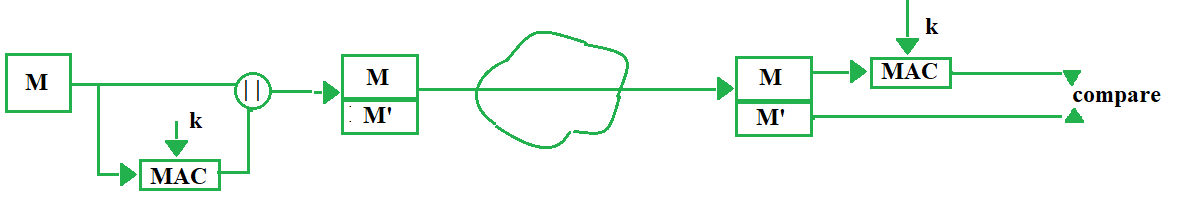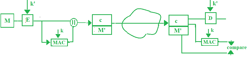 c = E(M, k') M' = MAC(c, k)
