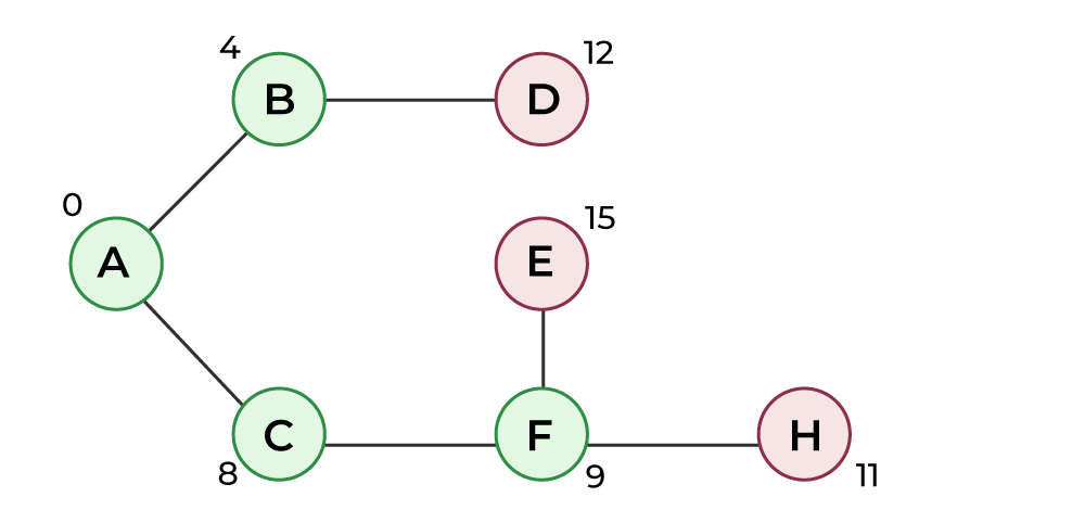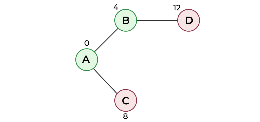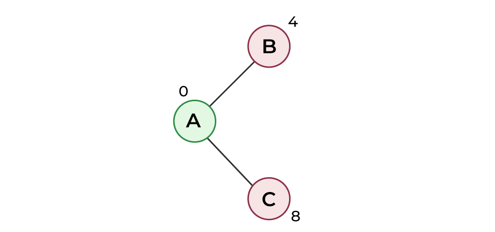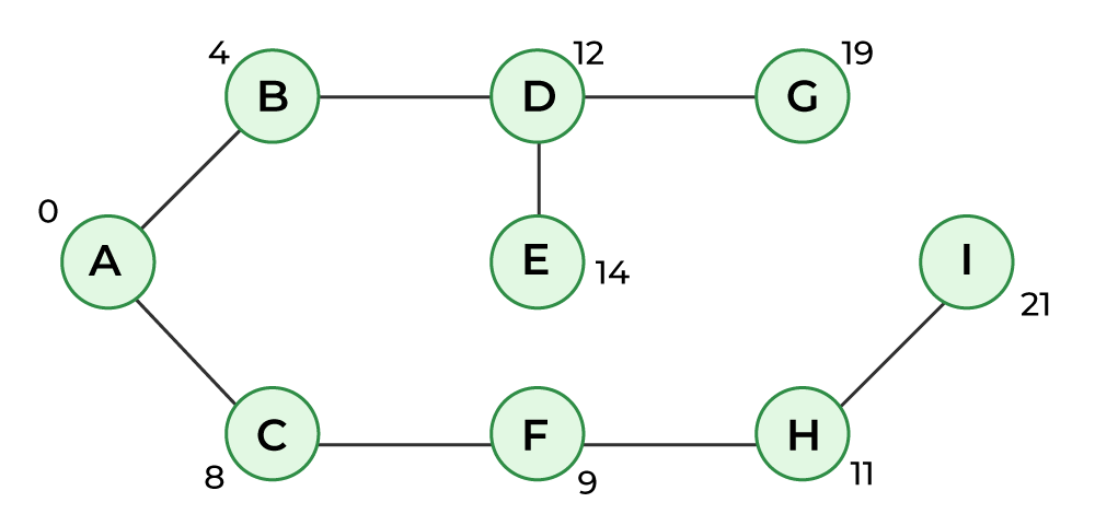 下图展示了各个顶点及其对应的距离值。属于SPT中的顶点都用绿色表示。