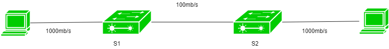 这是一个拓扑结构,其中有两个交换机,每个交换机上分别连接了一台电脑。交换机与电脑之间的传输速度达到了1000MB/s,而两个交换机之间的传输速度则达到了100MB/s。
