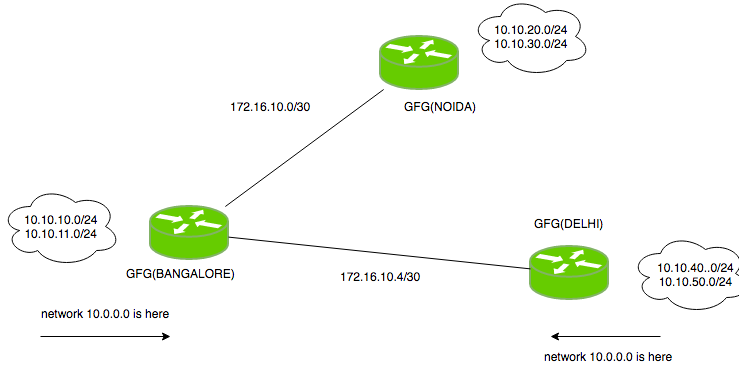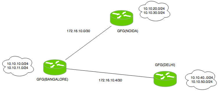 在这个小型拓扑结构中,有3台路由器(用户将在这些路由器上配置EIGRP协议),它们的名称分别是GfGNoida、GfGDelhi和GfGBangalore。如我们所见,GfGBangalore路由器需要通告以下网络:10.10.10.0/24、10.10.11.0/24、172.16.10.0/30以及172.16.10.4/30。因此,现在需要对GfGBangalore路由器进行EIGRP协议的配置。