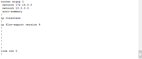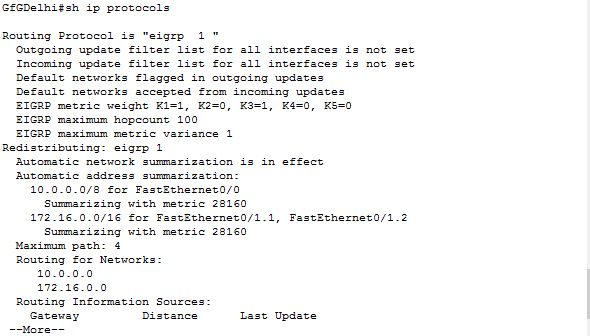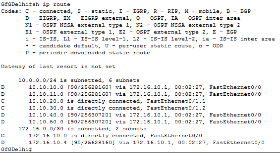 GfGDelhi(config)#router eigrp 1 GfGDelhi(config-router)#network 172.16.10.4 GfGDelhi(config-router)#network 10.10.50.0 GfGDelhi(config-router)#network 10.10.40.0现在,对GfGNoida进行类似的EIGRP配置。需要被通告的网段分别是:10.10.20.0/24、10.10.30.0/24以及172.16.10.0/30。