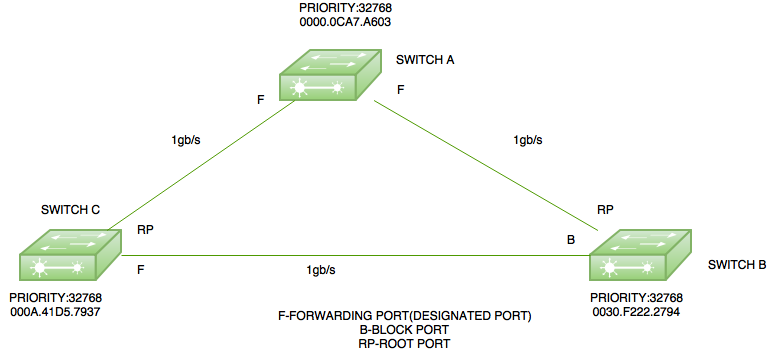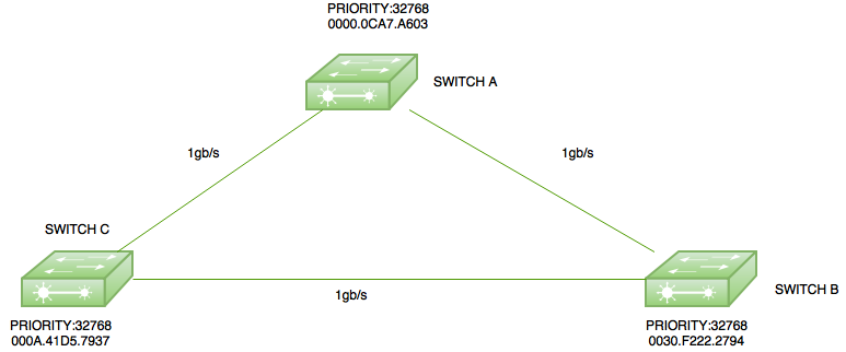 这里有一个简单的拓扑结构,其中包含三个交换机:交换机A的MAC地址为0000.0ACA7.A603,交换机B的MAC地址为0030.F222.2794,而交换机C的MAC地址为000A.41D5.7937。这三个交换机的默认优先级均为32768。
