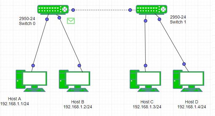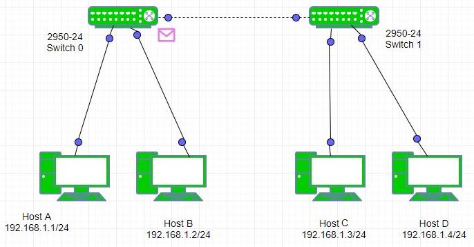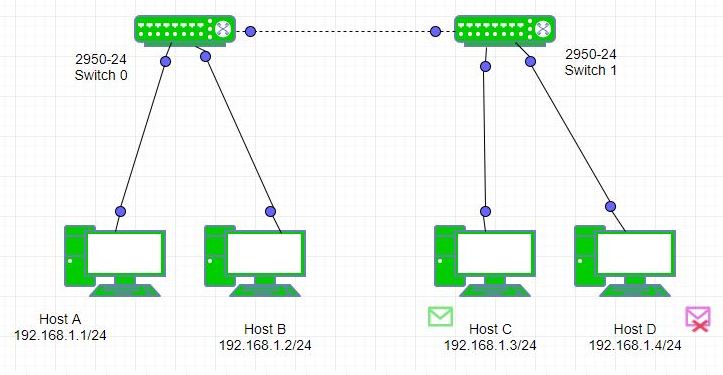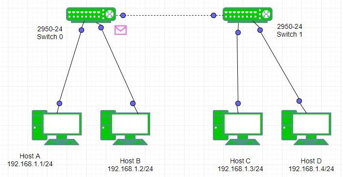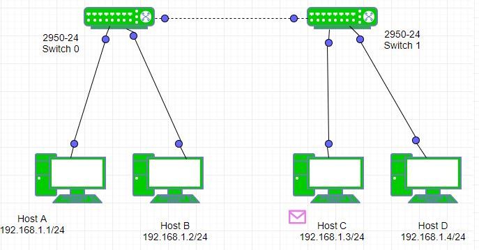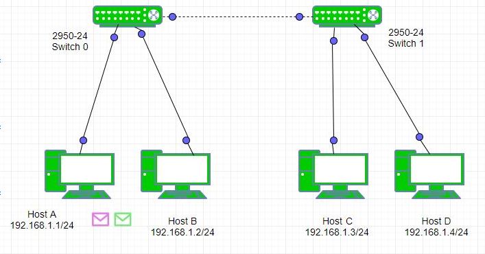 示例 –这里有一个简单的网络拓扑结构,其中包含主机A(192.168.1.1/24)、主机B(192.168.1.2/24)、主机C(192.168.1.3/24)以及主机D(192.168.1.4)。此外,还有两台交换机位于这些主机之间。该网络能够理解交换机MAC地址的学习过程,其实现方式是通过从主机A向主机C发送ping请求来实现。最初,这两台交换机的MAC表中都只包含对另一台交换机的记录而已。