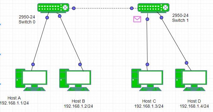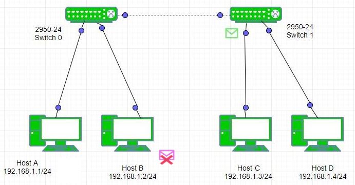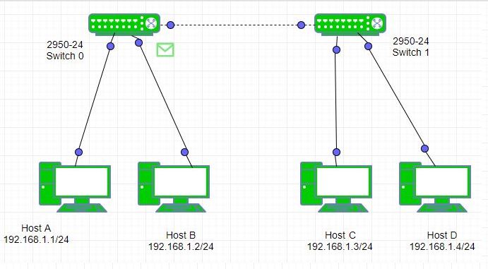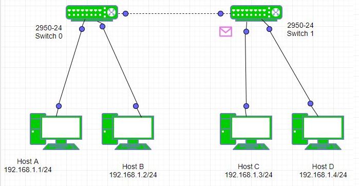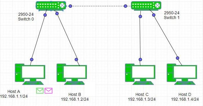 注意:在这里,switch1已经知道了switch0和主机A在同一端口fa0/1上的不同MAC地址。因为主机A是通过fa0/1与switch0相连的,所以它们的MAC地址是相同的。现在,switch1会向主机C和主机D发送ARP帧,因为它们处于同一个广播域中。