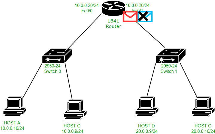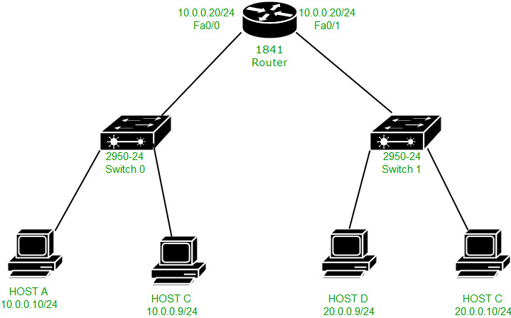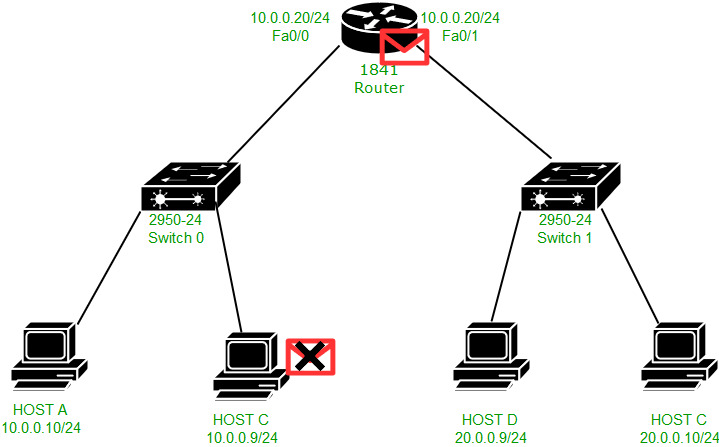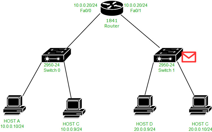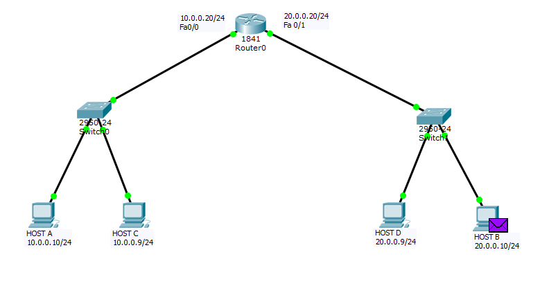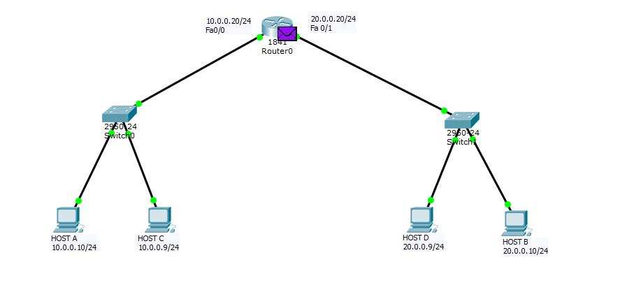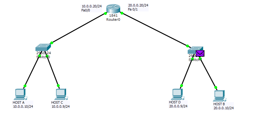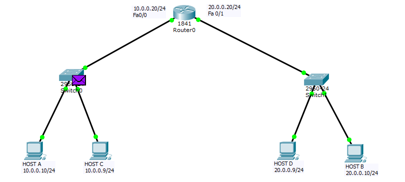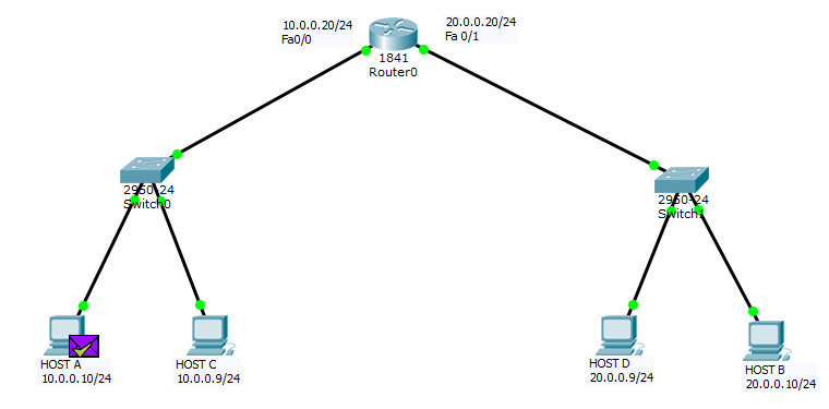 在这里,路由器的fa0/0接口中的MAC地址并未被用作源MAC地址。相反,使用的是fa0/1接口的MAC地址作为源MAC地址。因此,fa0/0接口无法用于其他广播域(例如20.0.0.0/24网络)。这样一来,PING命令实际上是在两个不同的网络中执行的。