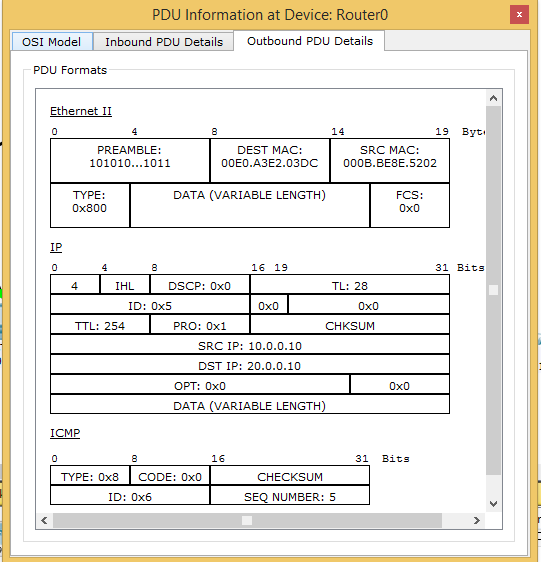 现在,ICMP数据包将被单播发送到默认网关。其IP地址为10.0.0.20,MAC地址为000B.BE8E.5201,如上图所示。