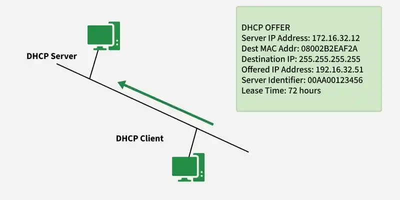 DHCP服务器会返回一个响应,其中包含可用的IP地址以及相关的配置选项,比如子网掩码、网关、DNS服务器以及租约期限等。