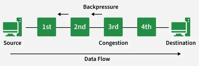 在上述图中,第三个节点处于拥塞状态,因此无法继续接收数据包。这样一来,第二个节点可能会因为输出数据流的速度变慢而陷入拥塞状态。同样地,第一个节点也可能出现拥塞情况,此时它会向源端发送信号,请求源端降低数据传输速度。