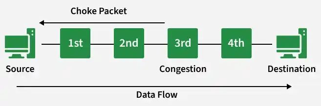 背压:当某个节点出现拥塞时,它会暂时停止接收来自上游节点的数据包,从而减缓流向源端的流量。这种机制可以将拥塞信号从网络的一端传播到另一端。这种方法主要适用于虚拟电路网络,因为在这些网络中,各个节点都知道自己的上游邻居节点的情况。例如,如果第三个节点出现拥塞,那么它就会停止接收数据包,这会导致第二个节点也出现拥塞现象,进而影响到第一个节点。最终,这些信息会被传递给源端,使其降低传输速度。