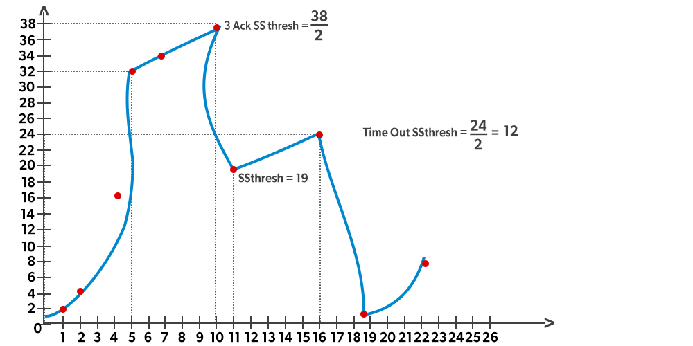 - 拥堵避免阶段:当达到阈值增量后,数值会增加1。