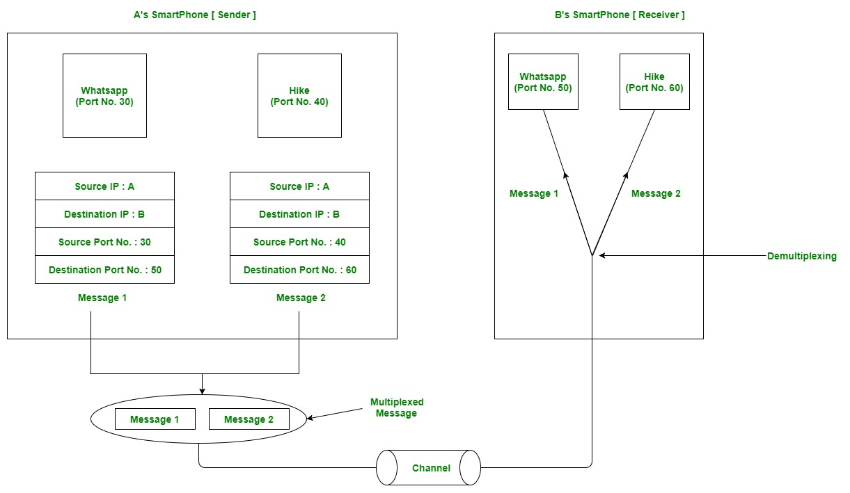 让我们来考虑一下目前被广泛使用的两种消息应用吧。 徒步旅行,同时还能使用WhatsApp通讯。 假设A是发送者,B是接收者。 发送方和接收方的设备上都安装了这些应用程序(比如智能手机)。 假设A想要通过WhatsApp向B发送消息,那么A和B都需要安装WhatsApp应用程序。 为此,A在通过WhatsApp应用程序发送消息时,必须注明B的IP地址以及WhatsApp的目标端口号。 同样地,在后者的情况下,A在发送消息时,也必须明确指出B的IP地址以及该消息的目标端口号。