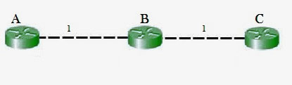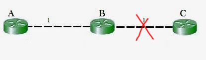 如果B和C之间的连接中断了,而B之前已经从A那里获得了路由信息,那么B可能会选择通过A来传输数据包。不过,A会直接把数据包发送回B,从而形成循环。但根据“分割视野规则”,节点A不会向B重新通告其到C的路由信息(即A→B→C)。从表面上看,这种做法似乎有些多余,因为B根本不会选择通过A来传输数据包,因为从B到C的直接路径成本要更高。