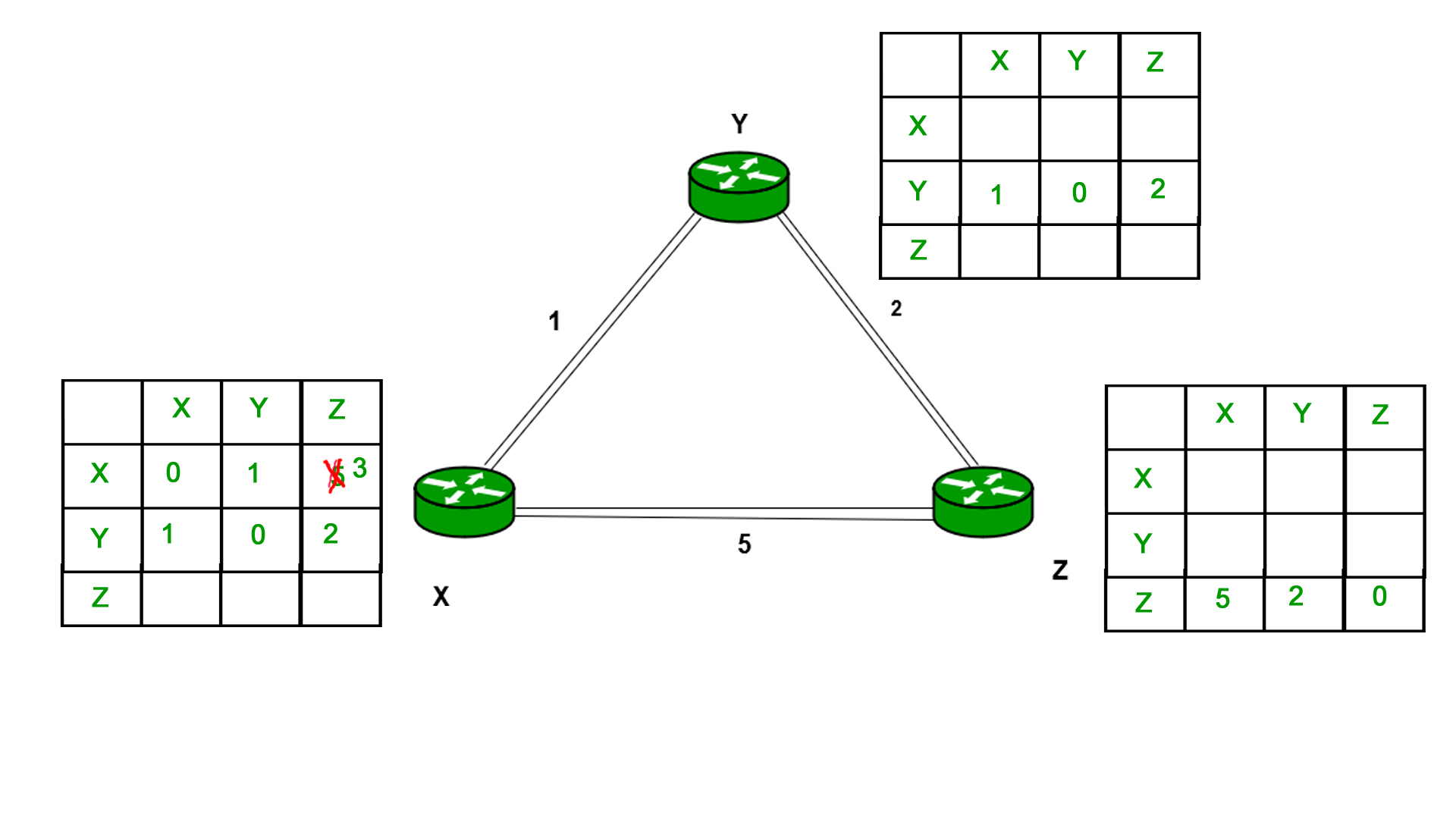 例如:如图所示,有3台路由器,分别命名为X、Y和Z。每台路由器都拥有自己的路由表。每个路由表中都包含了到达目标节点的距离信息。