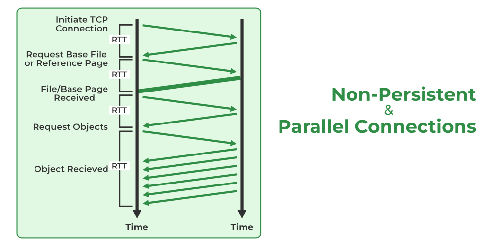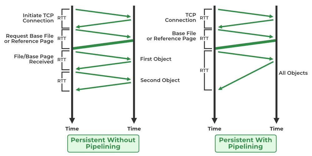 非流水线式持久连接:在非管道连接中,我们首先建立一种连接方式,该连接需要两个RTT值。然后,我们发送所有对象的图像/文本文件,这些文件的传输时间各为1个RTT(每个对象都不需要单独的TCP连接)。