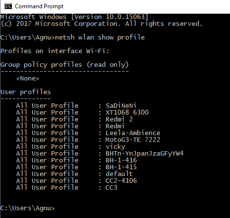 2) 输入“netsh wlan show profile”。它会显示所有之前与电脑连接过的 Wi-Fi 设备的详细信息。