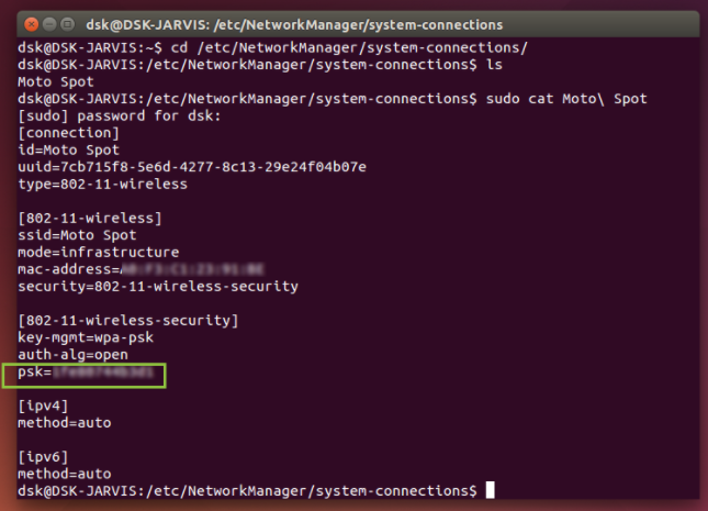现在,您将会看到保存在电脑上的无线网络名称。接下来,请输入以下命令,其中“wifi网络名称”即为您想要查询密码的无线网络名称。您可以在“psk”字段中看到密码,即“PASSWORD”。