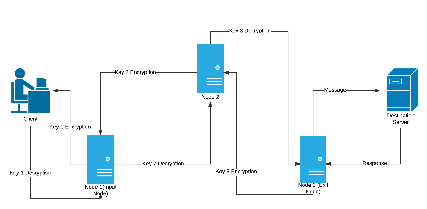 洋葱路由电路(采用清晰的图表来表示)- 拥有所有加密密钥的客户端,即键1、键2和键3该过程会将消息(即请求)进行三次加密处理。具体来说,消息会被分成三层来进行加密,就像洋葱一样,需要依次解开这些层才能获取原始消息。
