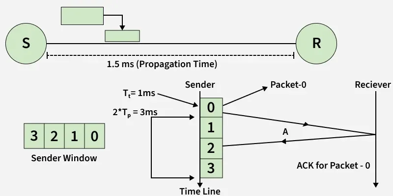 示例:设 Tt = 1 毫秒(每个数据包的传输时间),Tp = 1.5 毫秒(传播时间)。