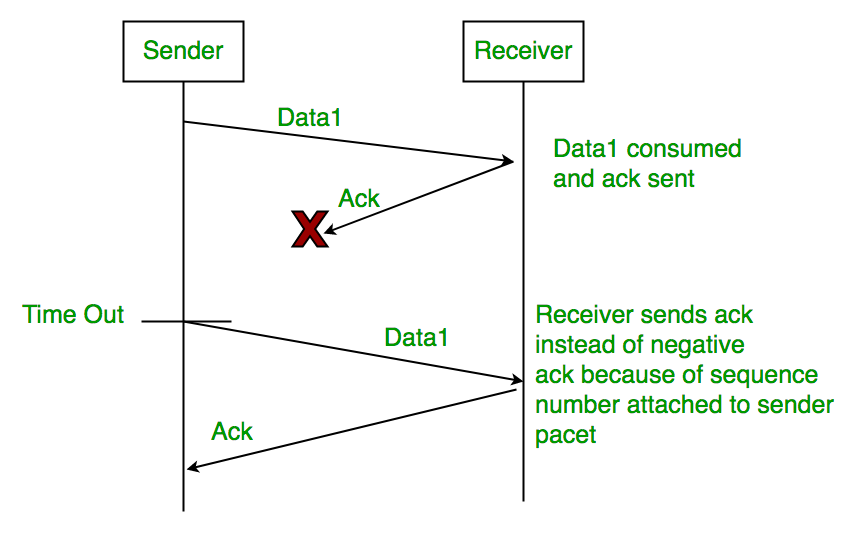 在这种情况下,发送方发送了一个数据包,该数据包被接收方成功接收了。接收方也发送了确认消息,但这条确认消息在网络中丢失了。由于发送方没有收到确认消息,它认为数据包没有被接收,因此不会继续发送下一个数据包。因为“停止等待”协议要求在继续传输之前必须得到确认消息。