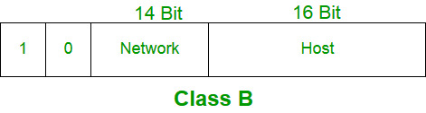 | B | 10 | 16 | 16 | 2¹⁴ = 16,384 | 2¹⁶ − 2 = 65,534 | 128.0.0.0 | 191.255.255.255 |