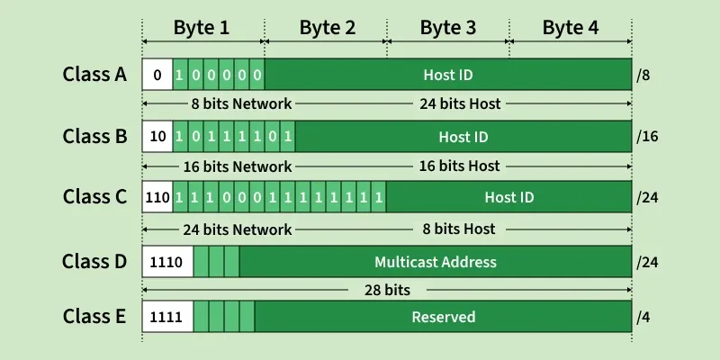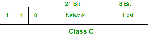 | C | 110 | 24 | 8 | 2²¹ = 2,097,152 | 2⁸ − 2 = 254 | 192.0.0.0 | 223.255.255.255 |