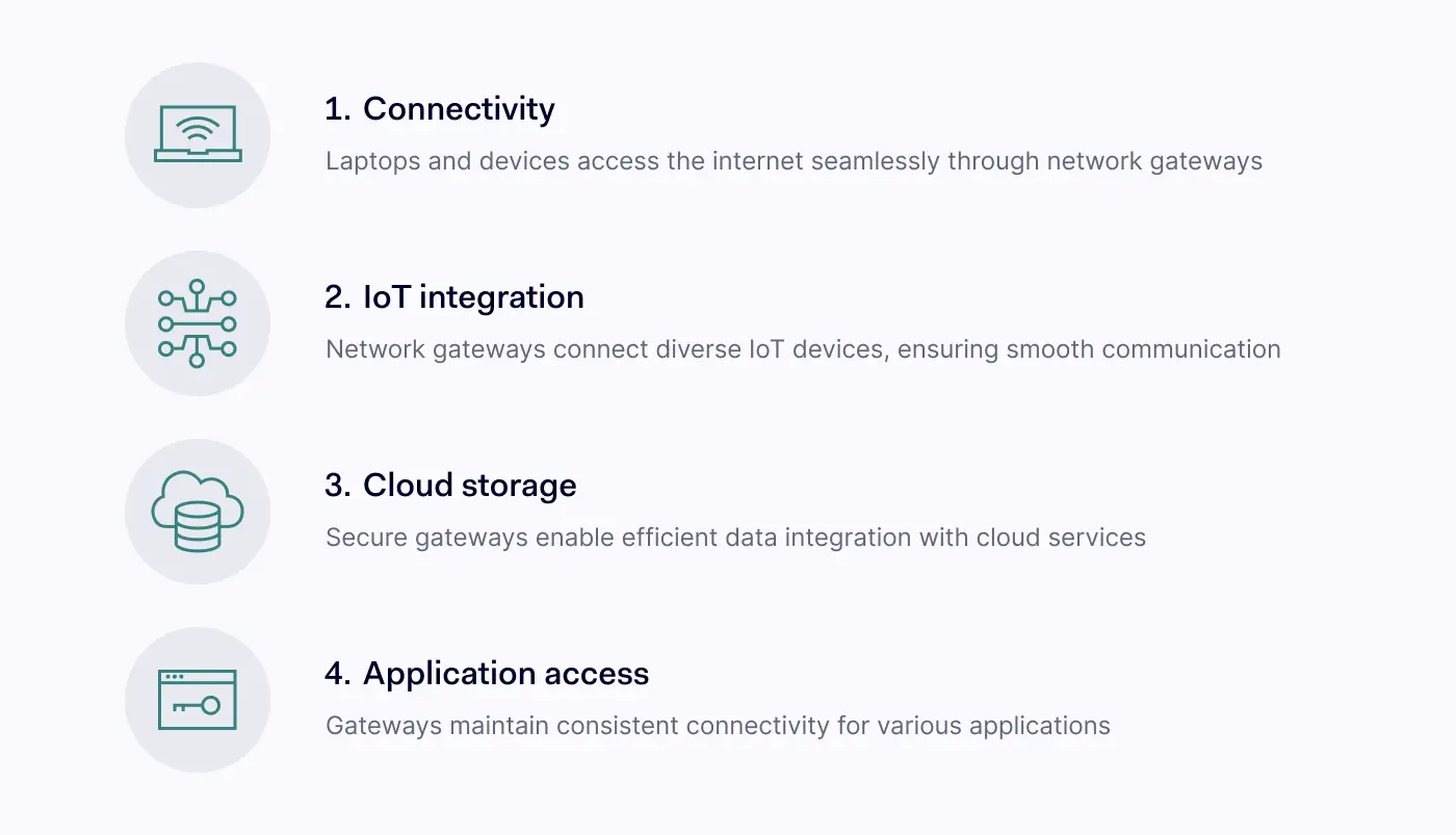 某些应用程序可能需要专门的连接方式,以确保连接的顺畅性。一个安全的网络网关必须确保这一点。其他数字资产的功能都符合预期。无论您是在访问本地网络还是云网络,在这两种情况下,网络网关都是实现该功能的关键组件。
