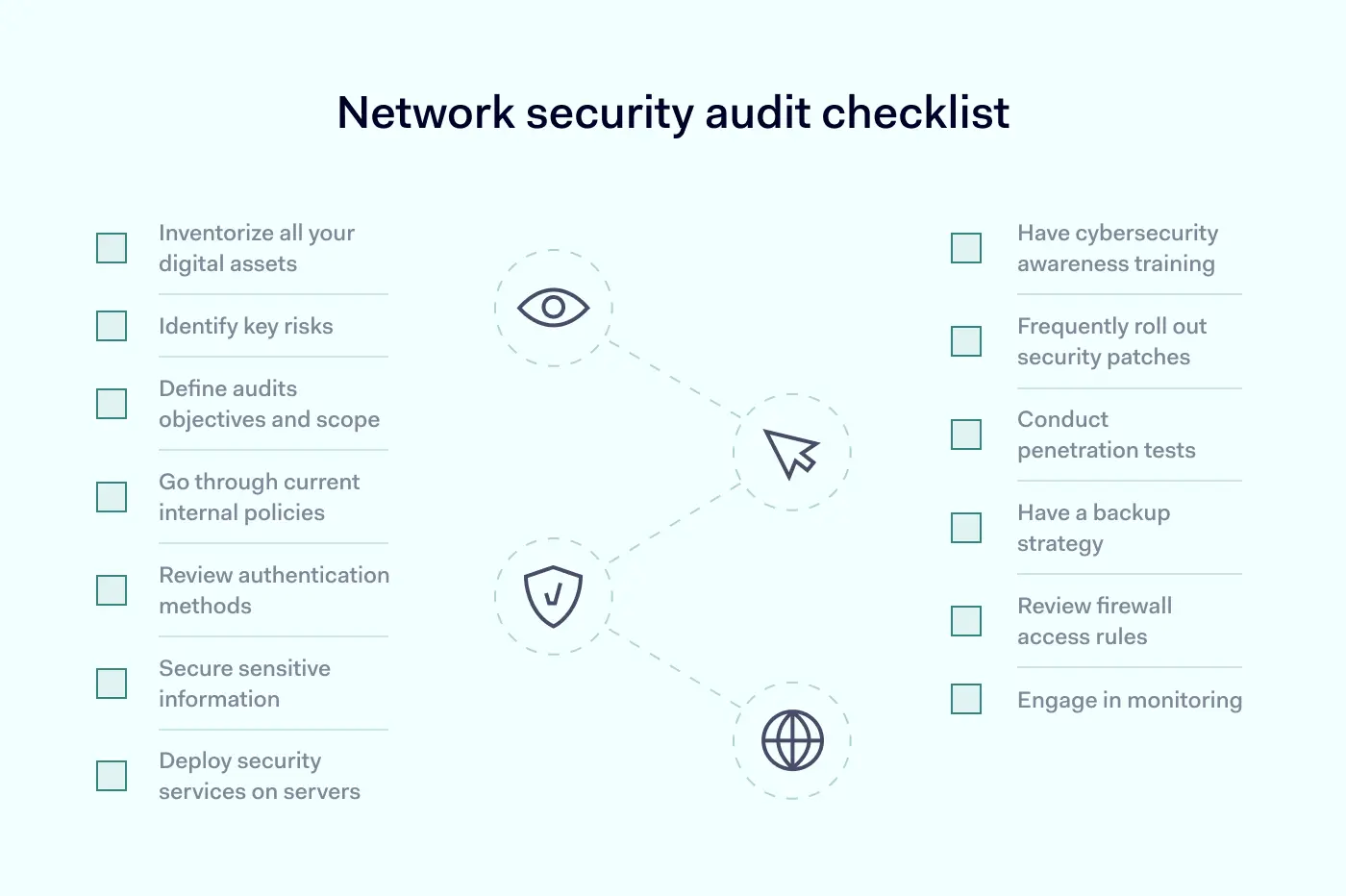 请记住,你不必自己完成所有事情,尤其是当你拥有足够的资源时。不过,如果你不想依赖第三方,而是希望独立完成这些工作,那么这里有一份网络安全审计检查清单,它应该能帮助你解决问题。