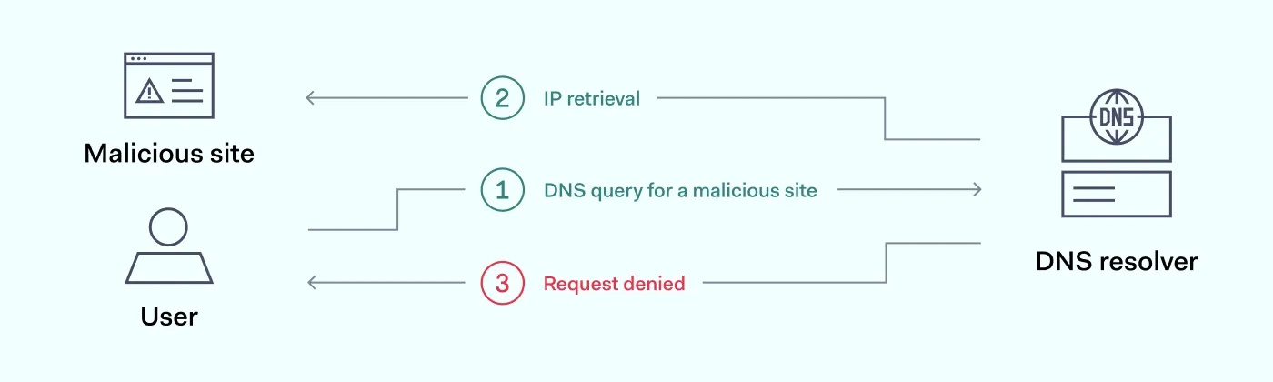 在这种情况下,当使用带有启用DNS保护的递归服务器时,每次进行DNS查询之前都会先检查该IP地址是否属于被标记为恶意域的地址。如果某个IP地址属于这些恶意域,那么DNS查询就会被拒绝,从而无法访问该网站。不过,如果检测不到任何安全威胁,那么DNS查询就会像使用普通的DNS服务器一样正常完成,用户则能够顺利到达目标页面。