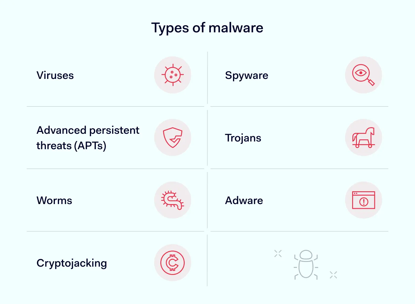 - 特洛伊人特洛伊木马通过模仿合法应用程序的特性来感染设备。它们利用这种隐藏状态来破坏软件或文件。