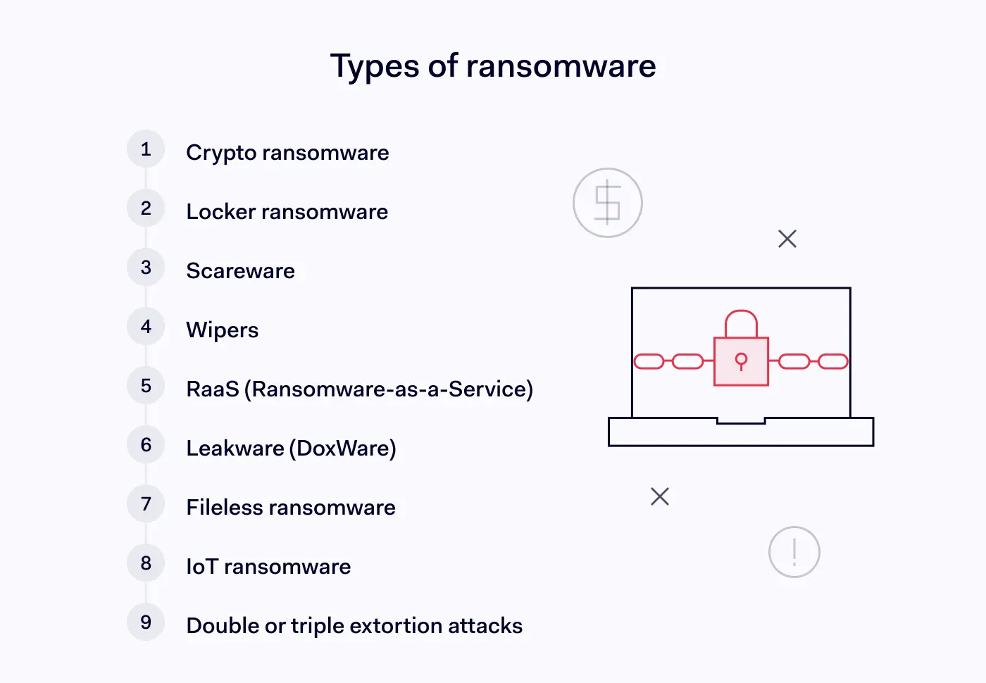 - 刮刀/擦拭器从技术上讲,这种攻击并不属于典型的勒索软件攻击,但它们具有类似的特性。在这些攻击中,攻击者会利用恶意软件来删除或加密重要的文件。其目的通常是给目标组织造成破坏和损害。