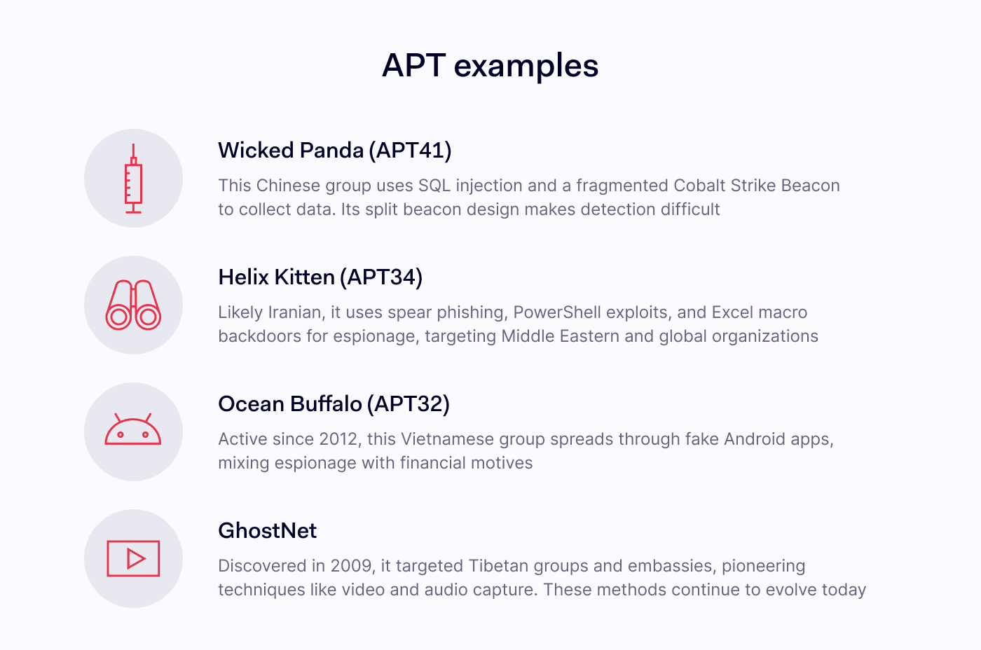 最近出现了许多高级持续性威胁的案例。每个此类威胁都有其独特的特征和目标。有些威胁的目的是获取敏感数据或知识产权以进行出售;而另一些则属于政治性破坏行为。