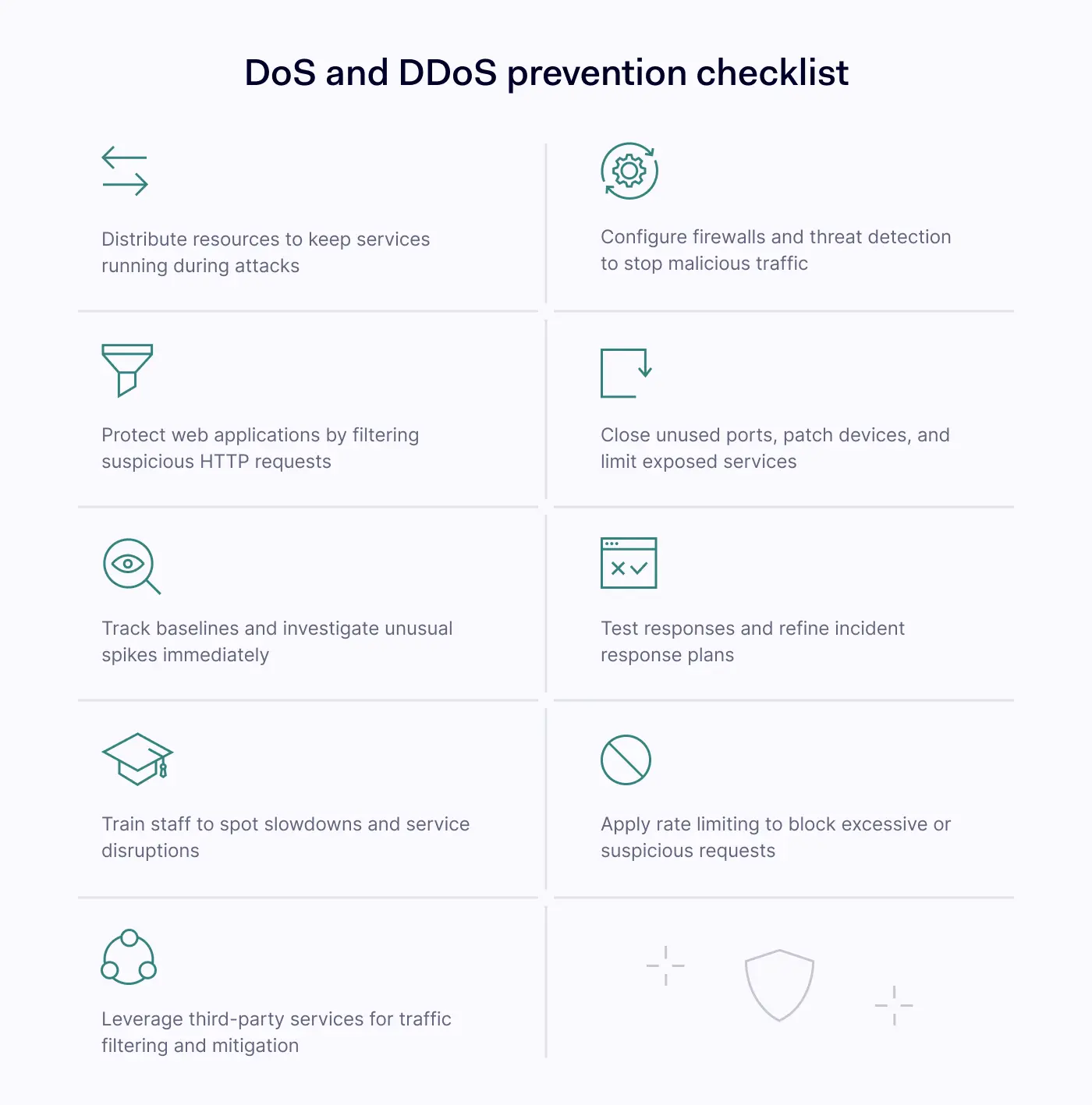 - 实施多层次的网络安全措施对网络进行深度防御,以应对突如其来的流量激增情况。配置防火墙,以便在体积性攻击发生之前检测到可疑的流量。使用威胁检测工具来清除机器人程序,并识别DoS攻击。