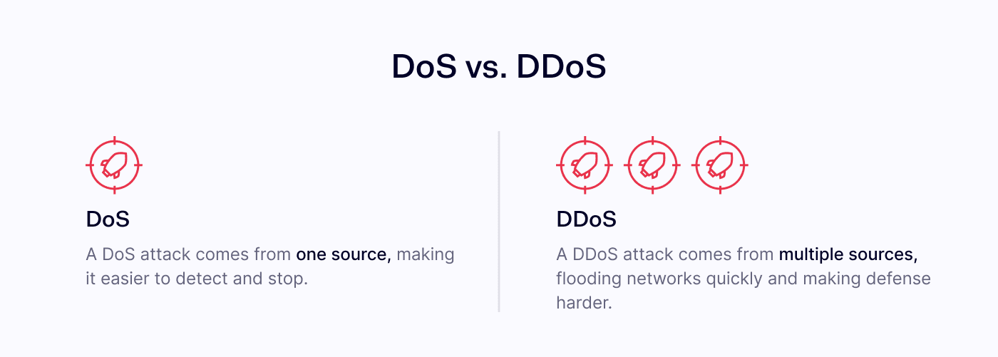 比较DoS攻击和DDoS攻击时,需要考虑的不仅仅是其规模问题。这两种严重的网络威胁在运作方式上有所不同,它们的症状也各不相同,对受害者的影响也各不相同。以下是几个主要的区别,这些区别有助于我们制定有效的应对策略: