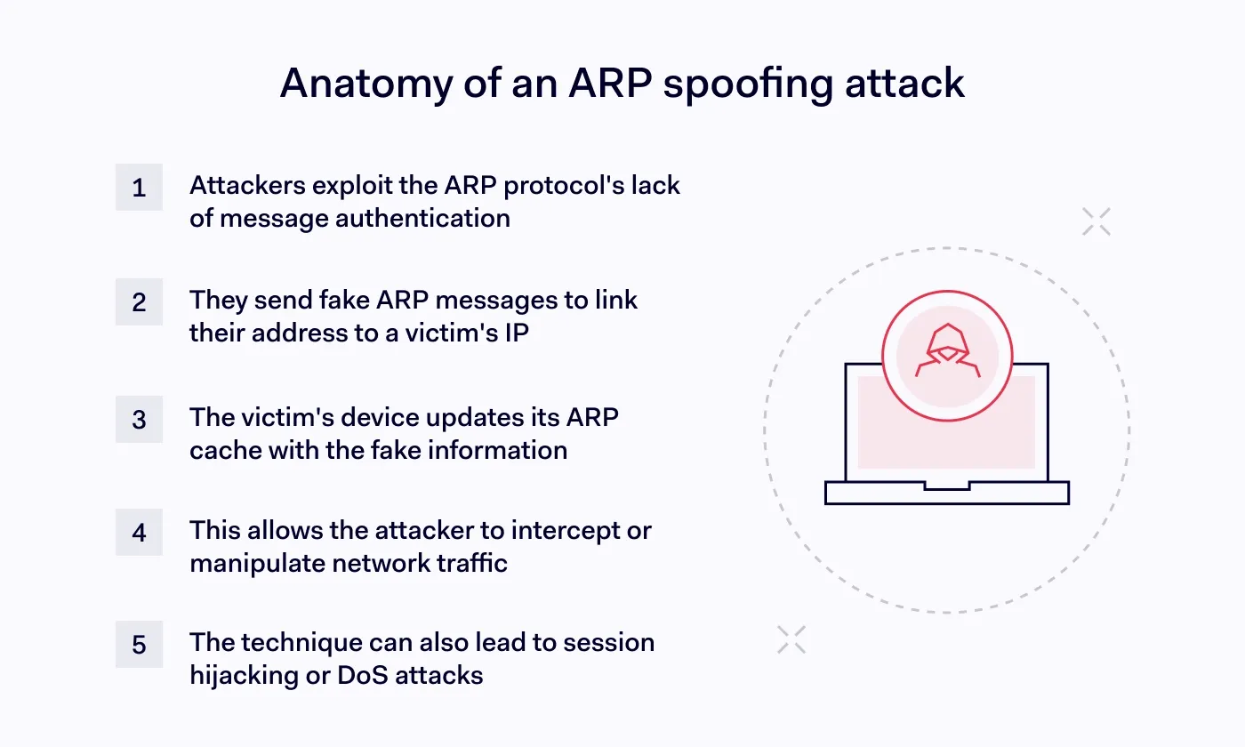 ARP欺骗利用了ARP协议中的漏洞,该协议用于连接网络中的MAC地址和IP地址。攻击者可以通过这种手段发起中间人攻击,向网络发送大量DoS攻击流量,甚至还可以窃取数据以用于恶意目的。