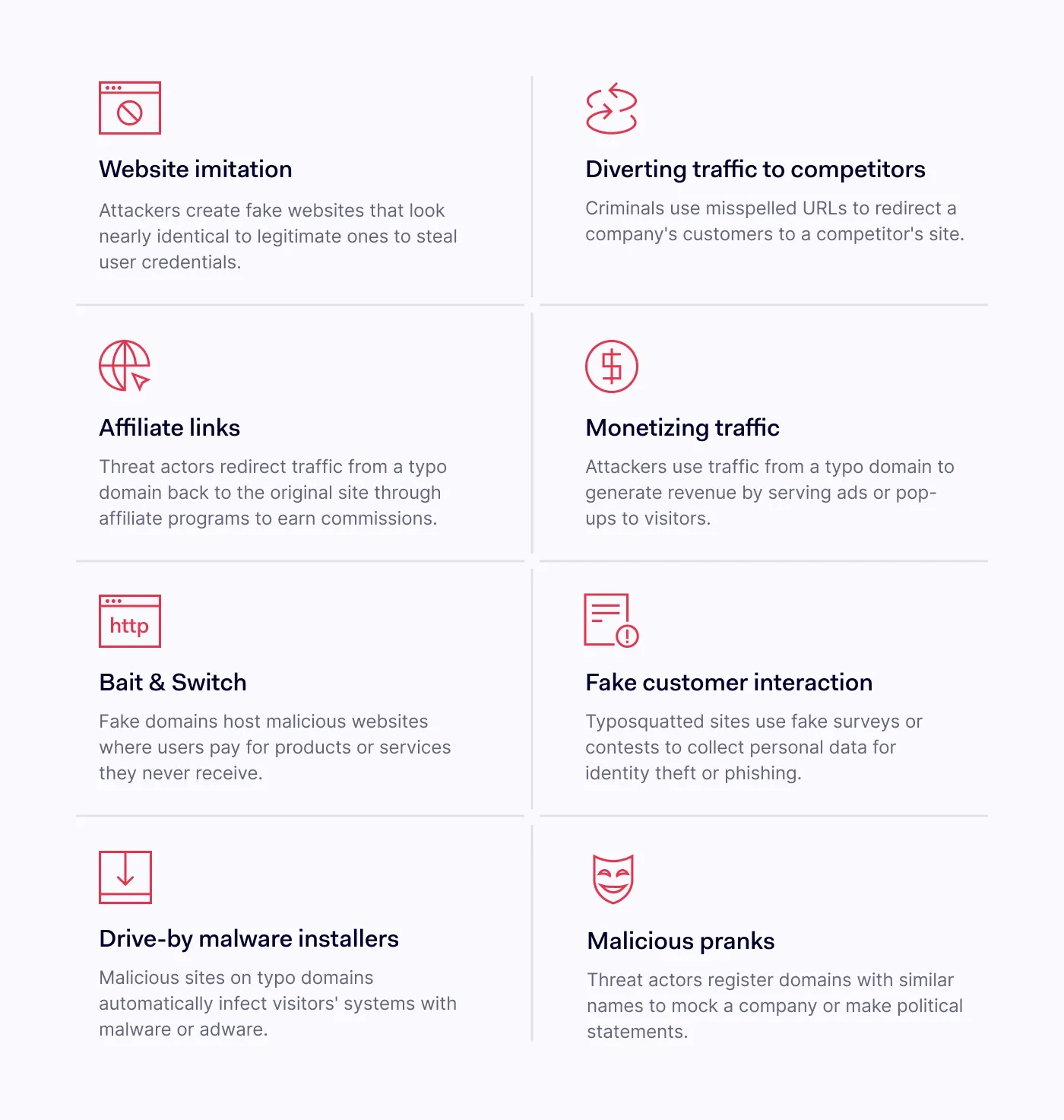 这些攻击手段利用了拼写错误来吸引来自合法网站的客户。虚假网站会将流量引导到那些提供类似服务的第三方网站上。犯罪分子从受害者那里收取费用,而受害者则失去了自己的业务。