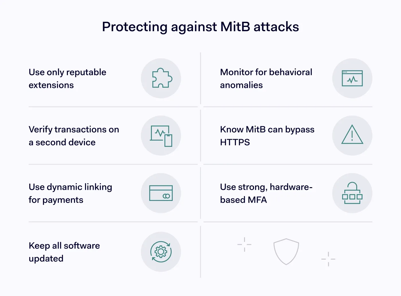 MitB攻击有时可以通过欺骗用户输入密码来绕过基本的多因素认证机制。不过,与短信验证码相比,硬件令牌和FIDO2密钥则更难被攻击所利用。采用更安全的身份验证方式,能够有效降低浏览器入侵的成功率。