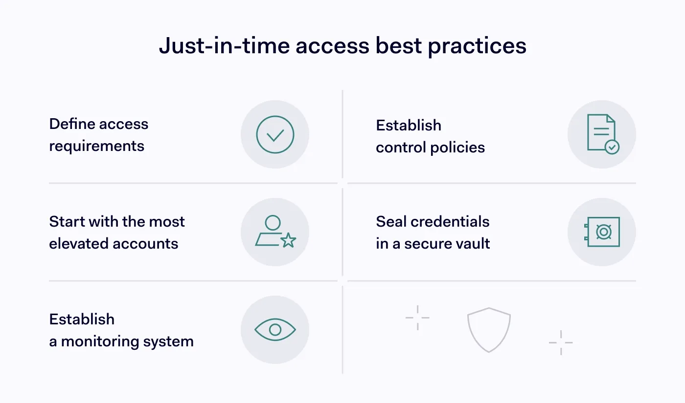 - 要有效实施即时访问功能,就需要制定合适的访问控制策略。应重点关注那些具有高级权限的账户,确保凭证存储在安全的存储库中,同时建立有效的监控系统。