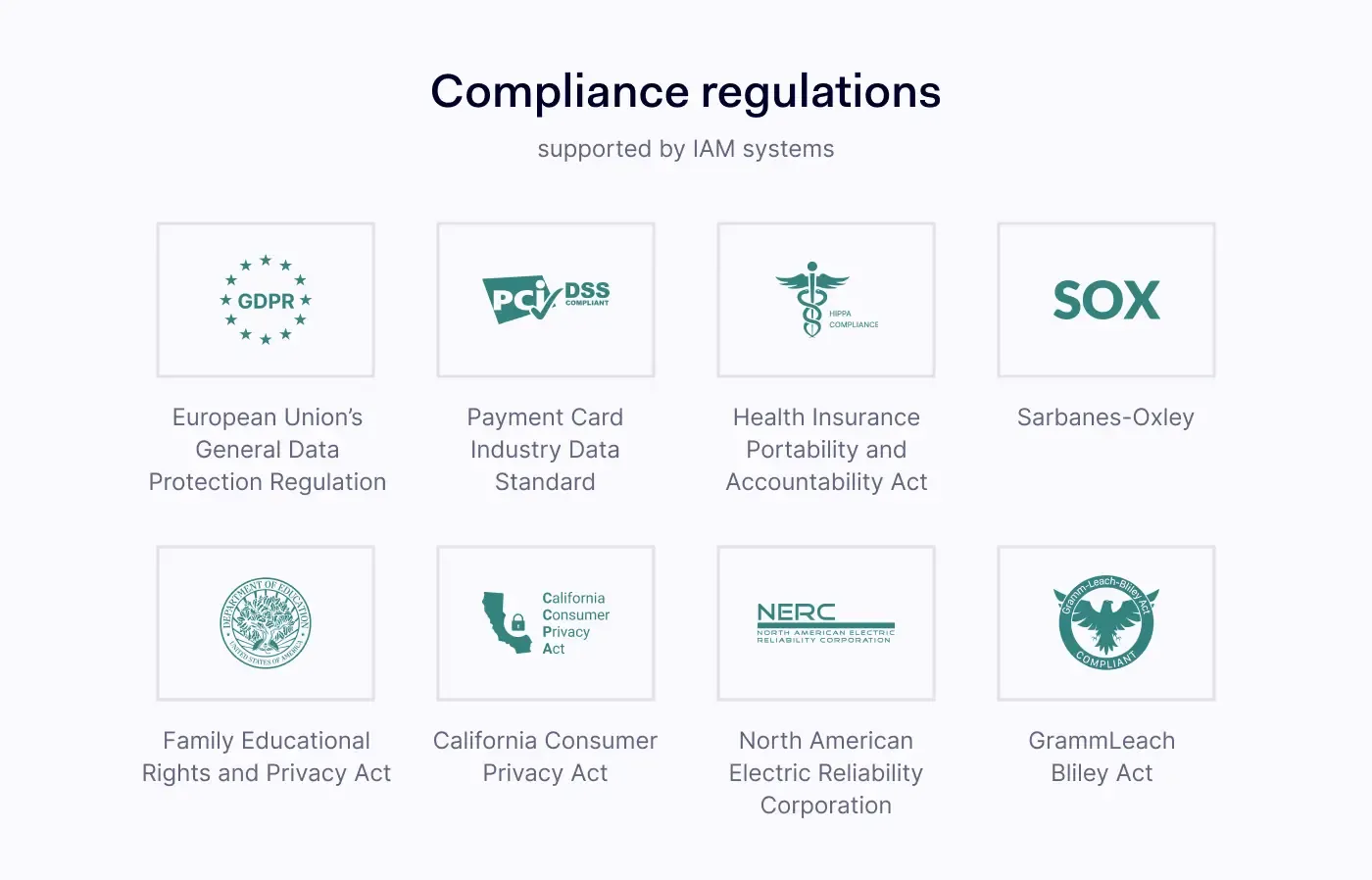 - IAM系统能够确保符合各种重要法规的要求,例如GDPR、PCI-DSS、HIPAA、SOX、CCPA、NERC、GLBA以及FERPA等。该系统通过管理用户的访问权限和数据管理功能,从而帮助企业遵守这些法规。
