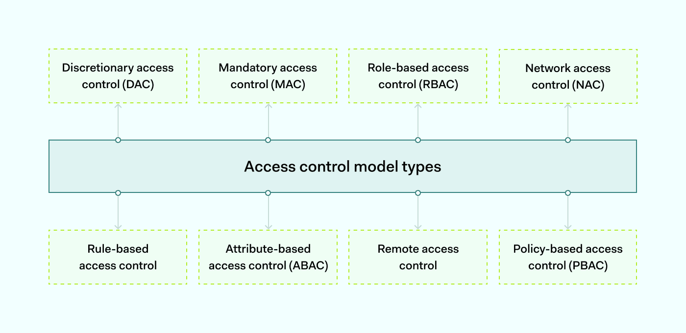 主要的访问控制模型包括:自主访问控制(DAC)、强制访问控制(MAC)、基于角色的访问控制(RBAC)、基于规则的访问控制、基于属性的访问控制(ABAC)、基于策略的访问控制(PBAC)、远程访问控制,以及网络访问控制(NAC)。
