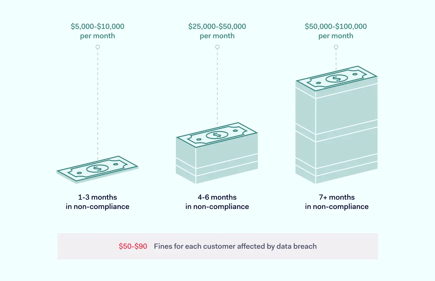 即使没有违反规定的证据,也有可能面临罚款。如果发生数据泄露的情况,商家通常会受到相应的处罚。在数据泄露事件中,信用卡处理机构通常会对每一条被暴露的客户信息记录处以50到90美元的罚款。此外,这些公司还可能被银行或信用卡处理机构暂时或永久性地排除在外。