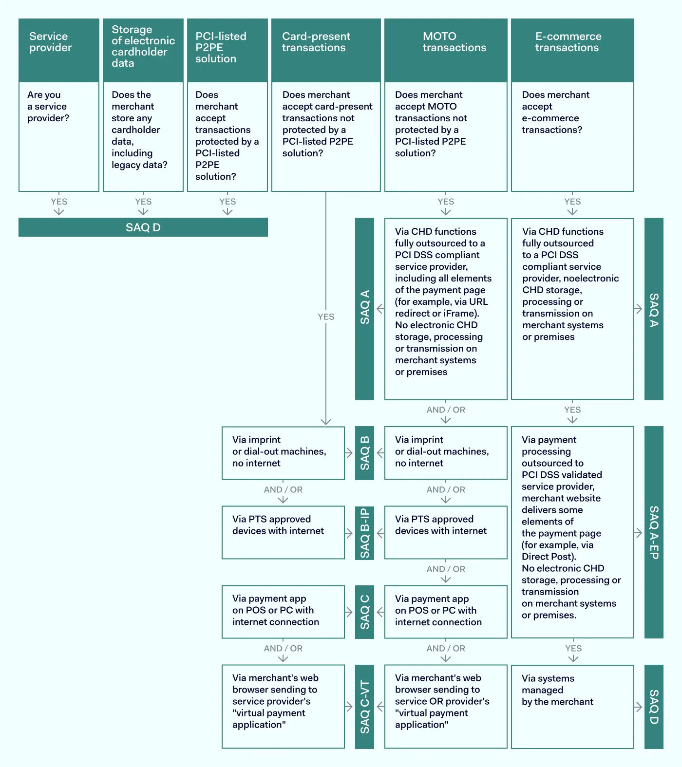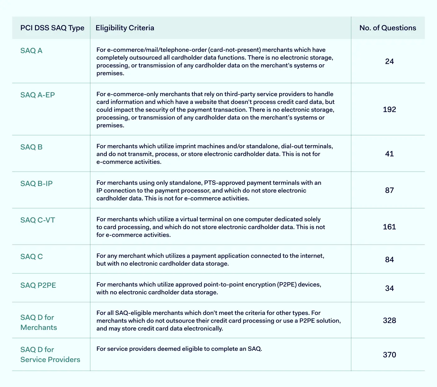- 如果您对选择哪个SAQ感到不确定,可以请专业人士来帮忙。合格的安全评估师(QSA)这是明智的做法。QSA会评估您的支付系统,并推荐应该使用的问卷。