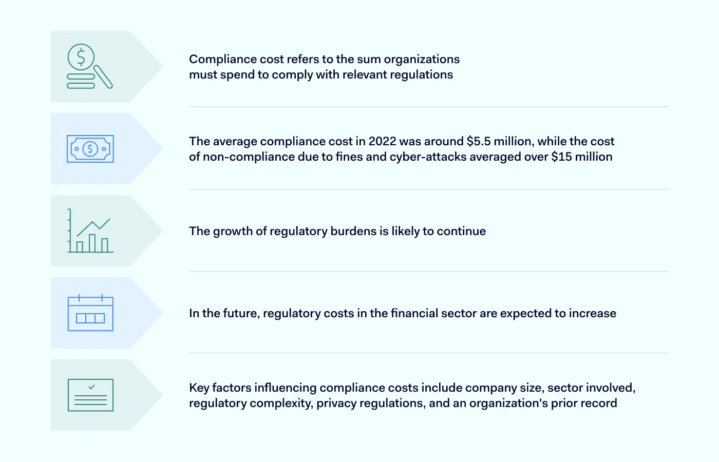 这篇文章将探讨合规成本的问题。我们将了解如何计算这些成本,以及有哪些法规需要遵守。换句话说,我们就能明白让企业符合各项法规所需的真实成本了。继续阅读以了解更多信息吧。