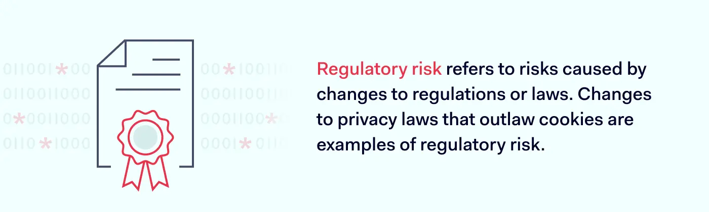 当法律或法规发生变化时,就会出现监管风险。例如,关于隐私法律的更新,比如禁止使用Cookie的规定,或者加密货币领域的金融监管变得更加严格,这些都可能带来监管风险。
