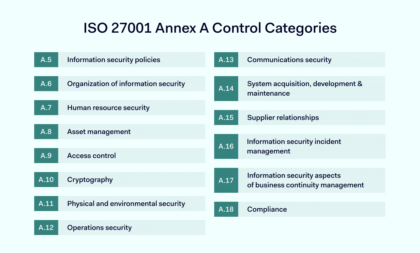 在2013版的ISO 27001标准中,控制措施被划分为14个类别。这些类别包括: