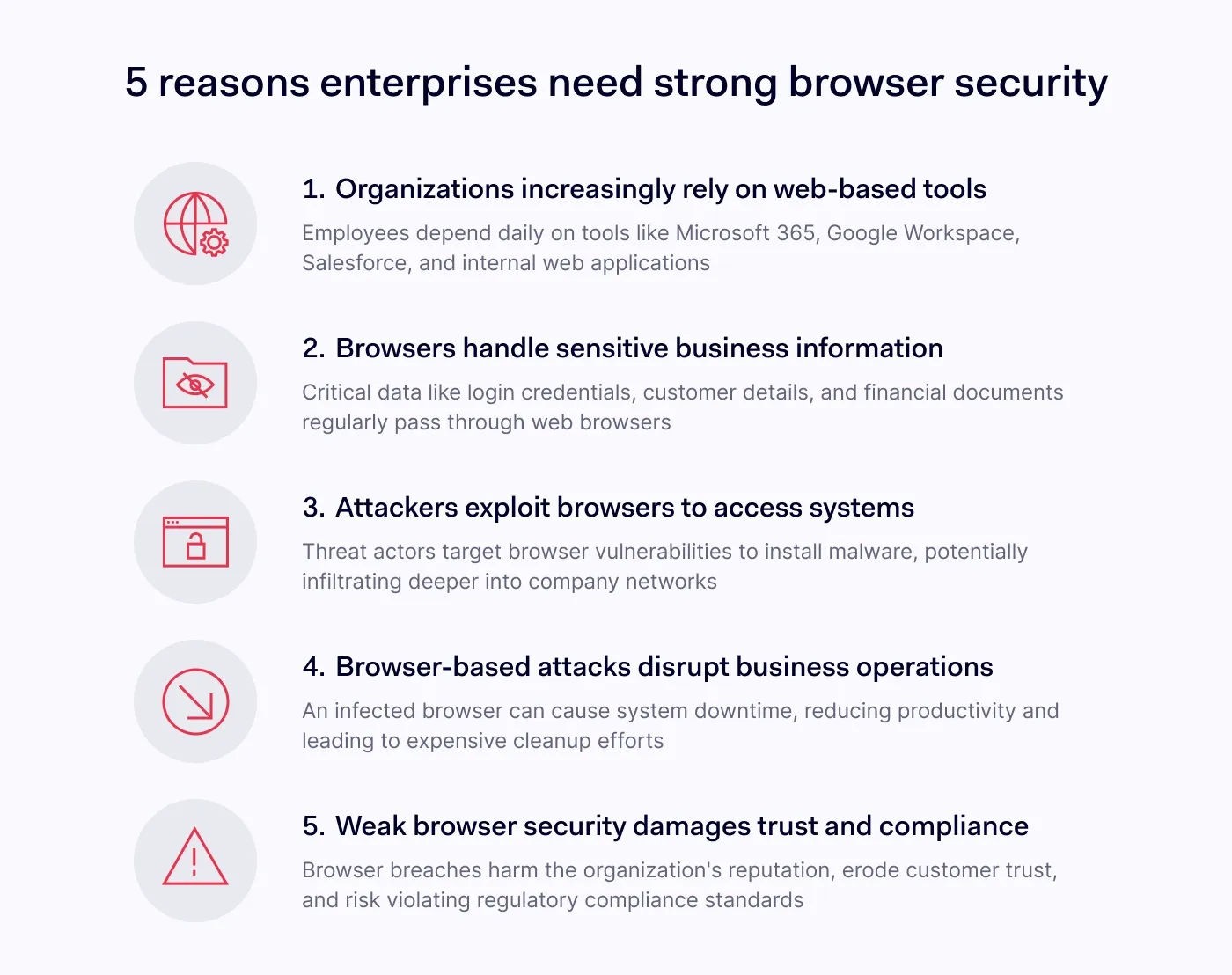 - 伤害声誉与信任程度:来自不安全的网络浏览器的安全事件,会削弱客户和合作伙伴的信任感。此外,还可能引发合规方面的问题。