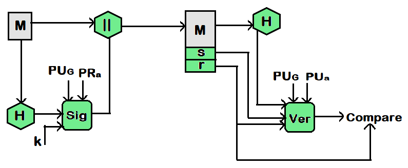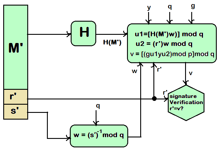 接收方需要生成一个数值 v,该数值是公钥组件、发送方的公钥以及消息的哈希码的函数。如果这个值与签名中的 r 值相匹配,那么该签名就被认为是有效的。