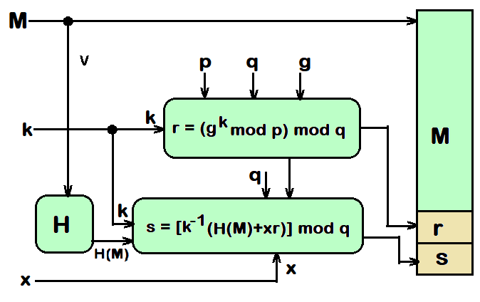 如果用户想要生成签名,那么用户需要计算两个数值:r和s。这两个数值与公钥组件(p、q、g)、消息的哈希值H(M)、用户的私钥(x)以及一个整数k有关。这个整数k必须被随机或伪随机地生成,并且对于每个签名来说都是唯一的。k是一个随机或伪随机生成的整数,且满足0 < k < q的条件。