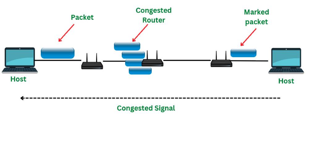 在显式拥塞通知机制中,路由器不会向主机发送额外的数据包,而是将某个数据包的头部字段设置为特定值,以表明网络已经处于拥塞状态。当任何数据包在网络中被传输时,目标设备会向发件人发送一个回复数据包,告知其发生了拥塞情况。在出现“阻塞数据包”的情况下,发件人将降低自己的传输速率。下图描述了显式拥塞通知机制的工作原理。