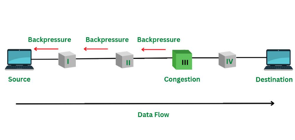 在由于信号传输缓慢而导致网络拥塞的情况下,仍然会接收到许多来自远距离的数据包。这些被阻塞的数据包会在每个处理步骤中产生影响,因此每个路由器都需要更多的缓冲区来存储这些数据。这种“逐跳反向压力”技术的核心目的是在网络出现拥塞时尽快缓解拥堵情况。该技术的数据传播方向与正常数据传播方向相反,主要应用于虚拟电路中。下图详细描述了“逐跳反向压力”技术的工作原理。